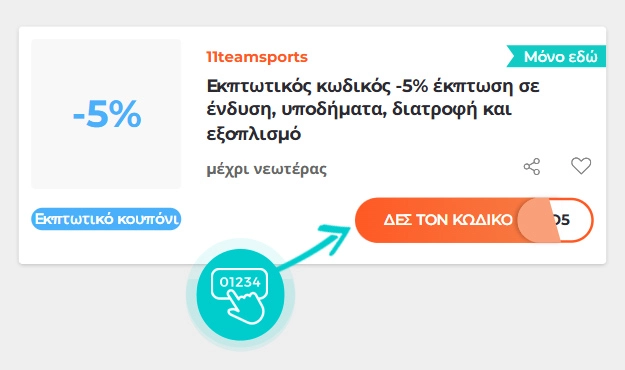 Επιλέξτε έναν συγκεκριμένο εκπτωτικό κωδικό στην ιστοσελίδα μας που θέλετε να χρησιμοποιήσετε στο e-shop 11teamsports.gr Κάντε κλικ στο πορτοκαλί κουμπί "ΕΜΦΑΝΙΣΗ ΚΩΔΙΚΟΥ".