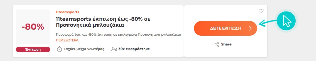 Επιλέξτε μια συγκεκριμένη έκπτωση 11teamsports στην ιστοσελίδα μας και κάντε κλικ στο κουμπί «ΔΕΙΤΕ ΕΚΠΤΩΣΗ». Θα ανακατευθυνθείτε αυτόματα απευθείας στην προσφορά στο ηλεκτρονικό κατάστημα 11teamsports.gr, όπου μπορείτε να αγοράσετε το προϊόν με έκπτωση.