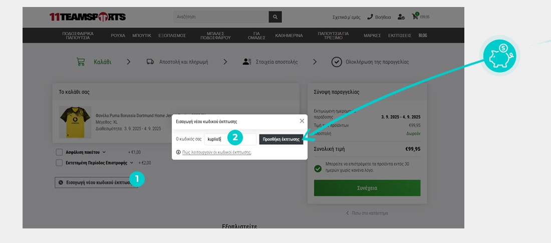 Δεν ξέρετε πώς ακριβώς λειτουργούν οι κωδικοί έκπτωσης στο 11teamsports.gr; Σας προσφέρουμε έναν γρήγορο και εύκολο τρόπο για να εφαρμόσετε κωδικούς έκπτωσης κατά τις αγορές: