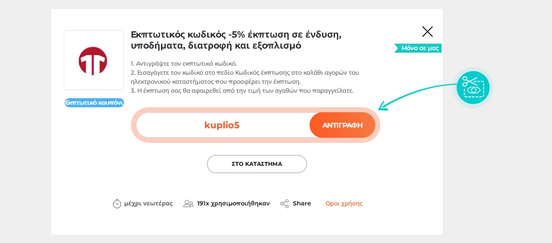 Μπορείτε να λάβετε έναν εκπτωτικό κωδικό με διάφορους τρόπους, για παράδειγμα, μπορείτε να επισκεφτείτε τον ιστότοπο του e-shop όπου μπορείτε να βρείτε ενημερωμένες εκπτώσεις, προσφορές και εκπτωτικούς κωδικούς ή μπορούν να σταλούν στο email σας μετά την εγγραφή σας στο κατάστημα. Μπορείτε επίσης να βρείτε ενημερωμένες προσφορές στη σελίδα μας KUPLIO.gr.