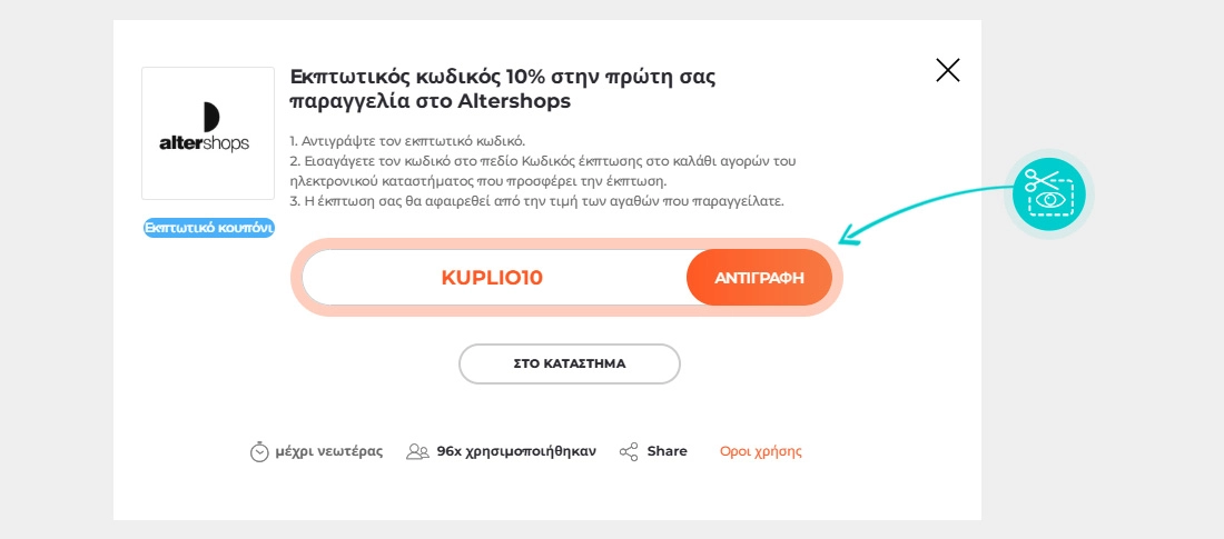 Αντιγράψτε ή σημειώστε τον εκπτωτικό κωδικό και κάντε κλικ στο κουμπί "ΣΤΟ ΚΑΤΑΣΤΗΜΑ". Στη συνέχεια θα ανακατευθυνθείτε απευθείας στο e-shop altershops.gr.