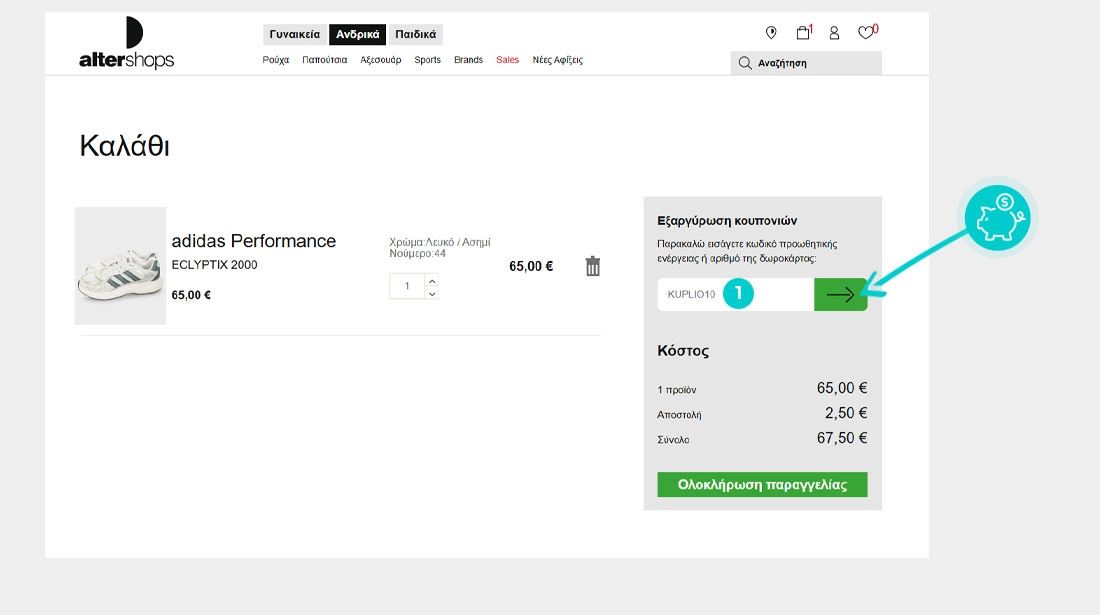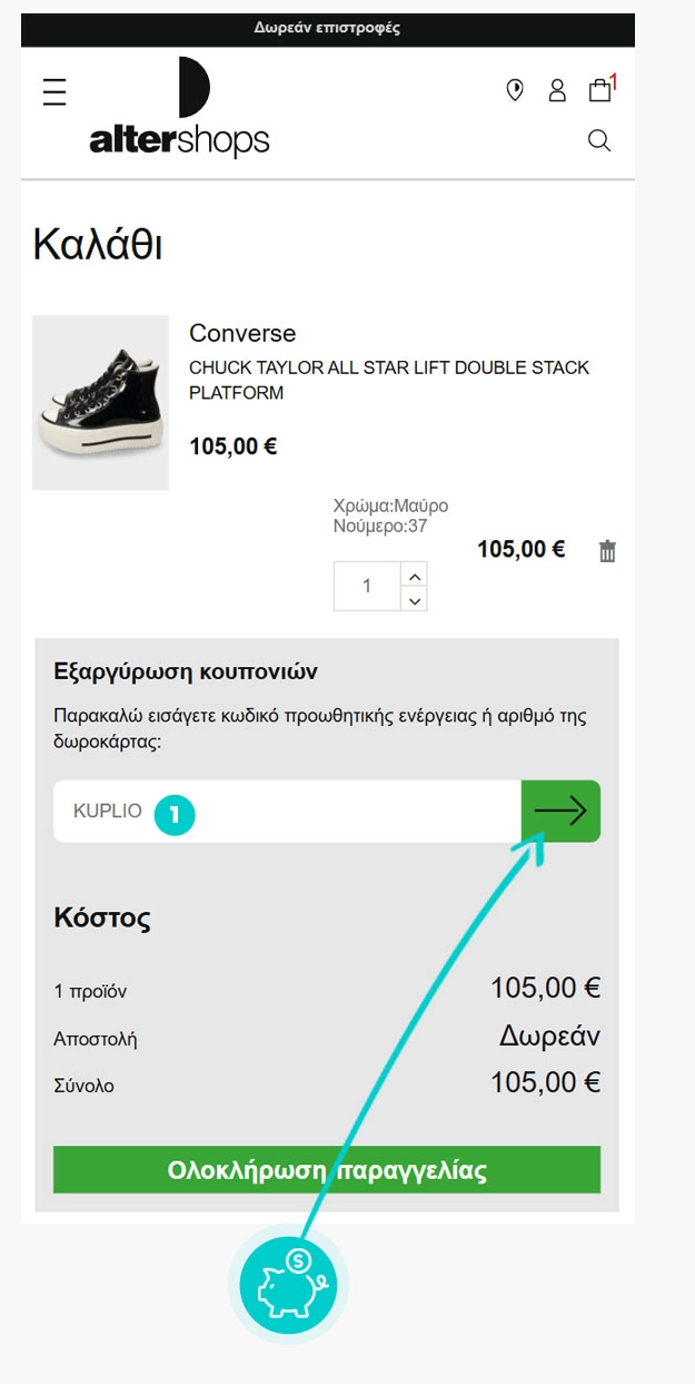 Επιλέξτε το προϊόν που σας ενδιαφέρει στο eshop altershops.gr, πατήστε το κουμπί «Προσθήκη στο καλάθι» και το προϊόν θα προστεθεί αυτόματα στο καλάθι αγορών. Απευθείας στο καλάθι αγορών, θα βρείτε το πλαίσιο "Εισαγωγή κωδικού έκπτωσης" στην ενότητα "Σύνοψη" στα δεξιά. Επικολλήστε εδώ τον αντιγραμμένο εκπτωτικό κωδικό ή πληκτρολογήστε τον χειροκίνητα και επιβεβαιώστε με το κουμπί "Εφαρμογή".