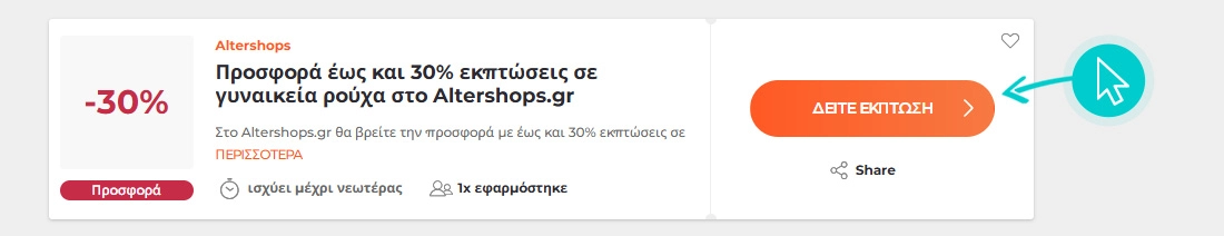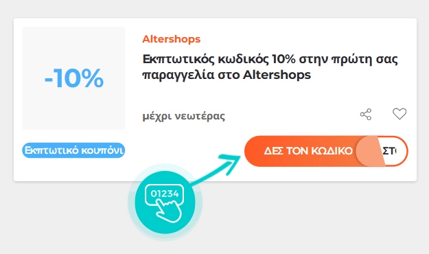 Επιλέξτε έναν συγκεκριμένο εκπτωτικό κωδικό στην ιστοσελίδα μας που θέλετε να χρησιμοποιήσετε στο e-shop altershops.gr. Κάντε κλικ στο πορτοκαλί κουμπί "ΕΜΦΑΝΙΣΗ ΚΩΔΙΚΟΥ".
