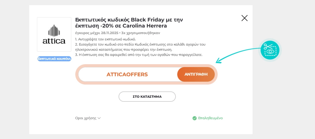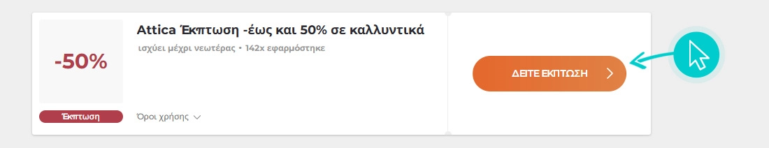 Επιλέξτε μια συγκεκριμένη έκπτωση Attica στην ιστοσελίδα μας και κάντε κλικ στο κουμπί «ΔΕΙΤΕ ΕΚΠΤΩΣΗ». Θα ανακατευθυνθείτε αυτόματα απευθείας στην προσφορά στο ηλεκτρονικό κατάστημα atticadps.gr, όπου μπορείτε να αγοράσετε το προϊόν με έκπτωση.