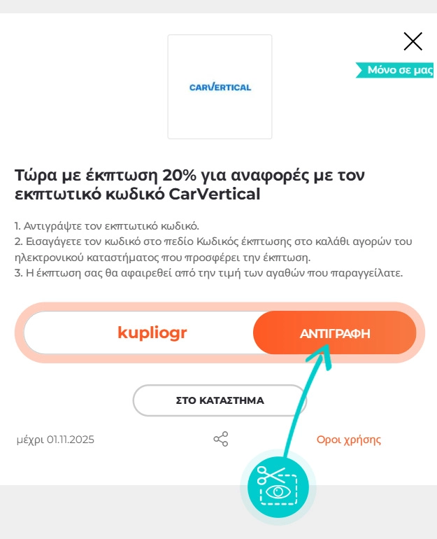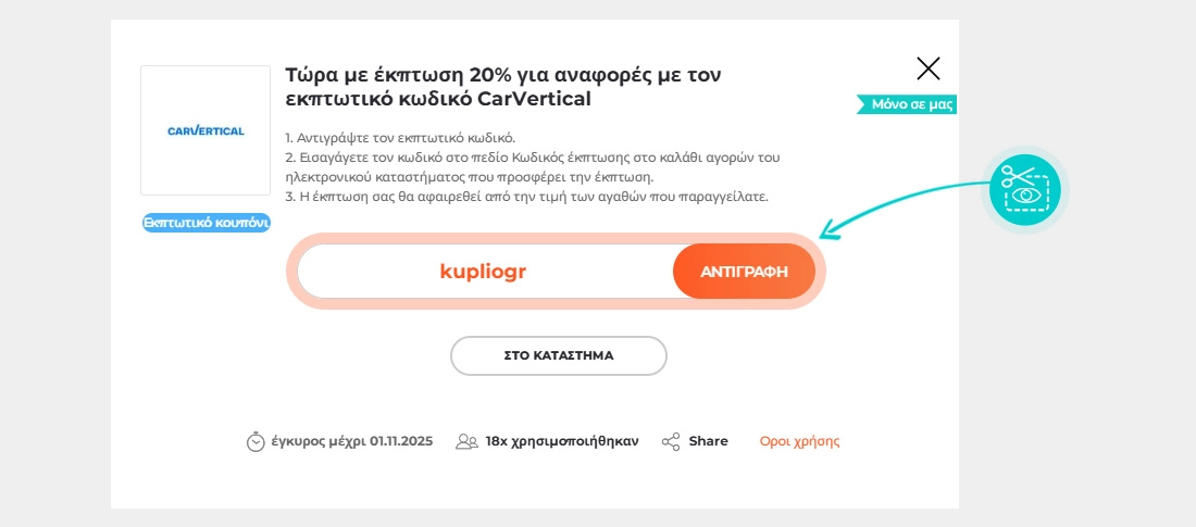 Αντιγράψτε ή σημειώστε τον εκπτωτικό κωδικό και κάντε κλικ στο κουμπί "ΣΤΟ ΚΑΤΑΣΤΗΜΑ". Στη συνέχεια θα ανακατευθυνθείτε απευθείας στο carvertical.com/gr.