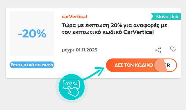 Ποσό έκπτωσης: -20% Πώς να εφαρμόσετε τον κωδικό; Κάντε κλικ εδώ και μάθετε πώς να το κάνετε.Εκπτωτικός κωδικός CarVertical με έκπτωση 15% για επιλεγμένη αναφορά οχήμαος. Ισχύει μετά την εγγραφή στο Newsletter. Οι εκπτώσεις και οι προσφορές, καθώς και οι εκπτωτικοί κωδικοί, καθορίζονται σύμφωνα με τους όρους και τις προϋποθέσεις της εταιρείας CarVertical.
