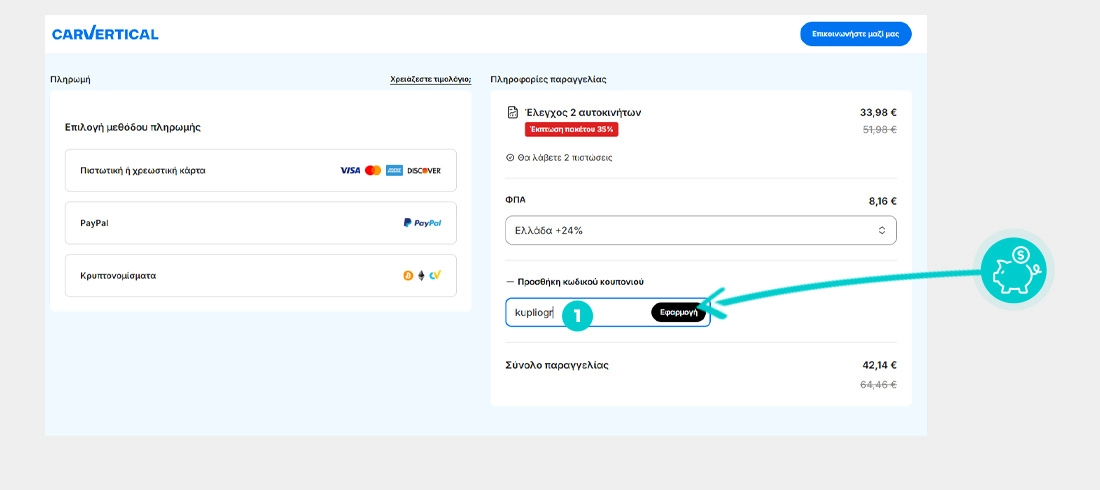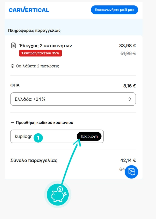 Επιλέξτε το προϊόν που σας ενδιαφέρει στο carvertical.com/gr, πατήστε το κουμπί «Προσθήκη στο καλάθι» και το προϊόν θα προστεθεί αυτόματα στο καλάθι αγορών. Απευθείας στο καλάθι αγορών, θα βρείτε το πλαίσιο "Εισαγωγή κωδικού έκπτωσης" στην ενότητα "Σύνοψη" στα δεξιά. Επικολλήστε εδώ τον αντιγραμμένο εκπτωτικό κωδικό ή πληκτρολογήστε τον χειροκίνητα και επιβεβαιώστε με το κουμπί "Εφαρμογή".