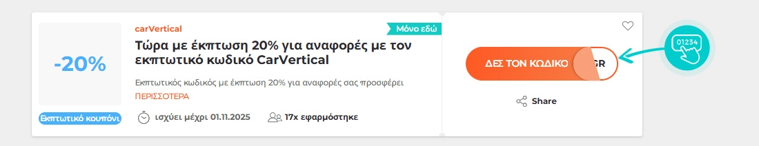 Επιλέξτε μια συγκεκριμένη έκπτωση carVertical στην ιστοσελίδα μας και κάντε κλικ στο κουμπί «ΔΕΙΤΕ ΕΚΠΤΩΣΗ». Θα ανακατευθυνθείτε αυτόματα απευθείας στην προσφορά στο ηλεκτρονικό κατάστημα carvertical.com/gr, όπου μπορείτε να αγοράσετε το προϊόν με έκπτωση.