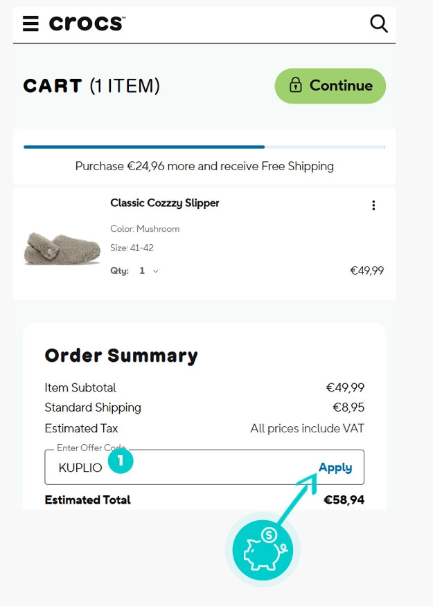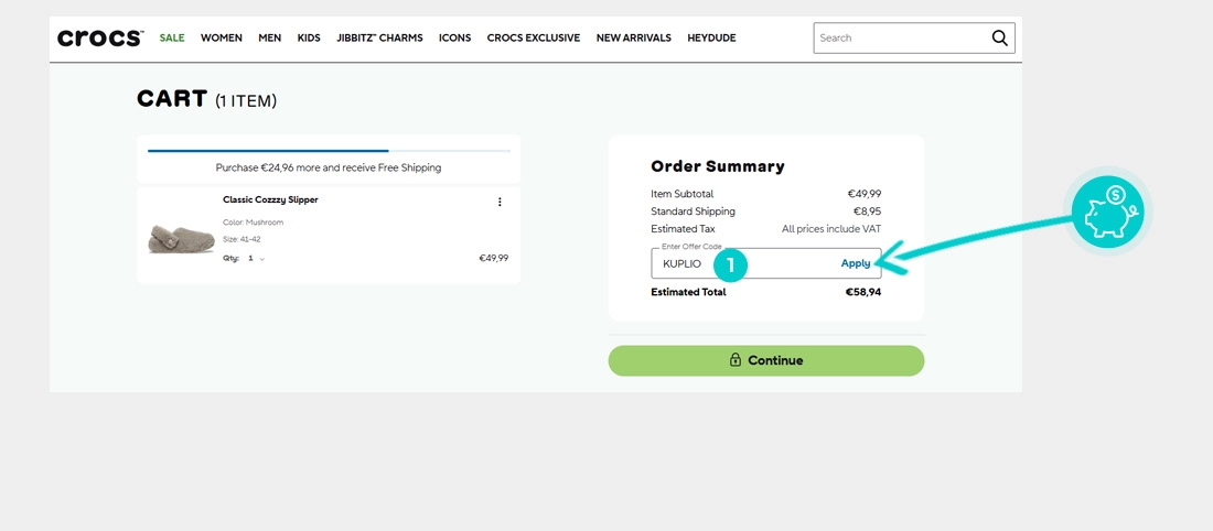 Επιλέξτε το προϊόν που σας ενδιαφέρει στο eshop crocs.eu, πατήστε το κουμπί «Προσθήκη στο καλάθι» και το προϊόν θα προστεθεί αυτόματα στο καλάθι αγορών. Απευθείας στο καλάθι αγορών, θα βρείτε το πλαίσιο "Εισαγωγή κωδικού έκπτωσης" στην ενότητα "Σύνοψη" στα δεξιά. Επικολλήστε εδώ τον αντιγραμμένο εκπτωτικό κωδικό ή πληκτρολογήστε τον χειροκίνητα και επιβεβαιώστε με το κουμπί "Εφαρμογή".