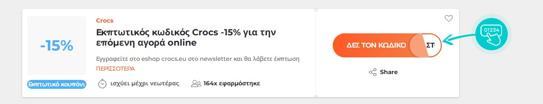 Επιλέξτε έναν συγκεκριμένο εκπτωτικό κωδικό στην ιστοσελίδα μας που θέλετε να χρησιμοποιήσετε στο e-shop crocs.eu. Κάντε κλικ στο πορτοκαλί κουμπί "ΕΜΦΑΝΙΣΗ ΚΩΔΙΚΟΥ".