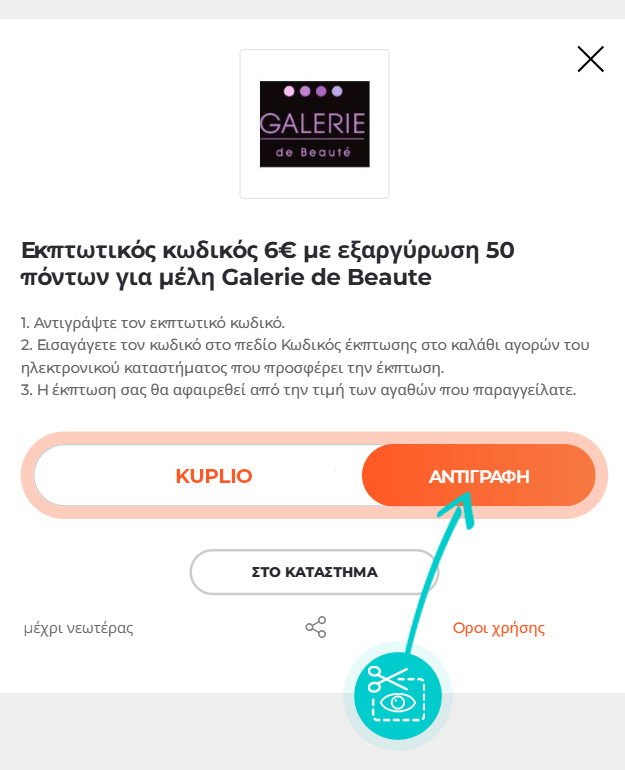 Αντιγράψτε ή σημειώστε τον εκπτωτικό κωδικό και κάντε κλικ στο κουμπί "ΣΤΟ ΚΑΤΑΣΤΗΜΑ". Στη συνέχεια θα ανακατευθυνθείτε απευθείας στο e-shop galeriedebeaute.gr.