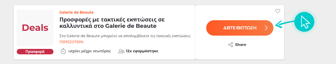Επιλέξτε μια συγκεκριμένη έκπτωση Galerie de Beaute στην ιστοσελίδα μας και κάντε κλικ στο κουμπί «ΔΕΙΤΕ ΕΚΠΤΩΣΗ». Θα ανακατευθυνθείτε αυτόματα απευθείας στην προσφορά στο ηλεκτρονικό κατάστημα galeriedebeaute.gr, όπου μπορείτε να αγοράσετε το προϊόν με έκπτωση.