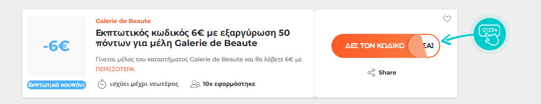 Ποσό έκπτωσης: -100% Πώς να εφαρμόσετε τον κωδικό; Κάντε κλικ εδώ και μάθετε πώς να το κάνετε.Γίνεται μέλος του καταστήματος Galerie de Beaute και θα λάβετε 6€ με την εξαργύρωση 50 πόντων. Διαβάστε τους αναλυτικούς όρους & τις προϋποθέσεις του προγράμματος Club de Beauté στην ιστοσελίδα.