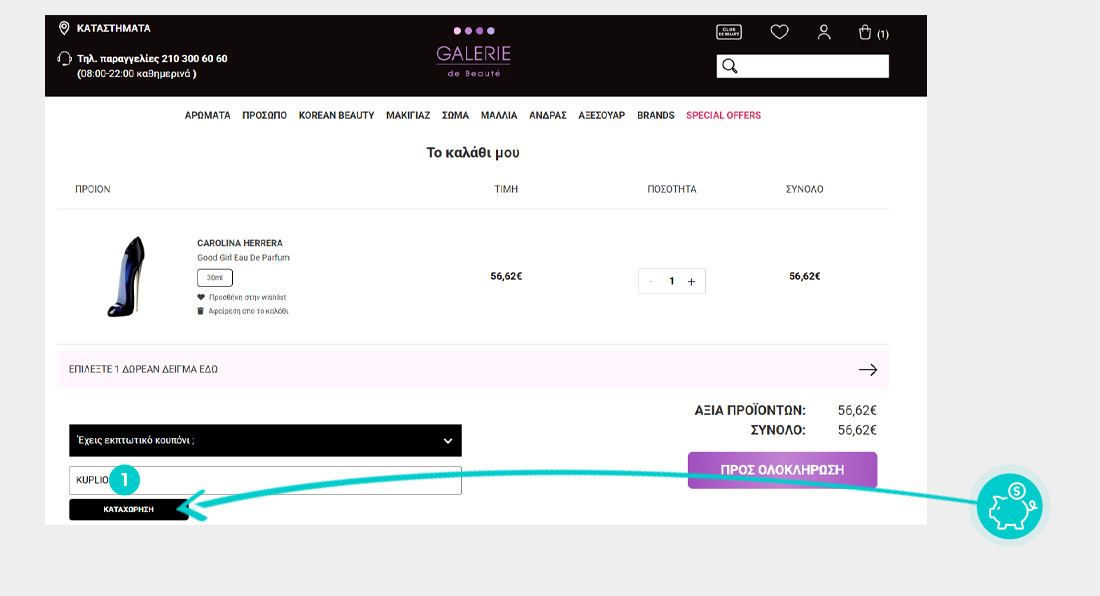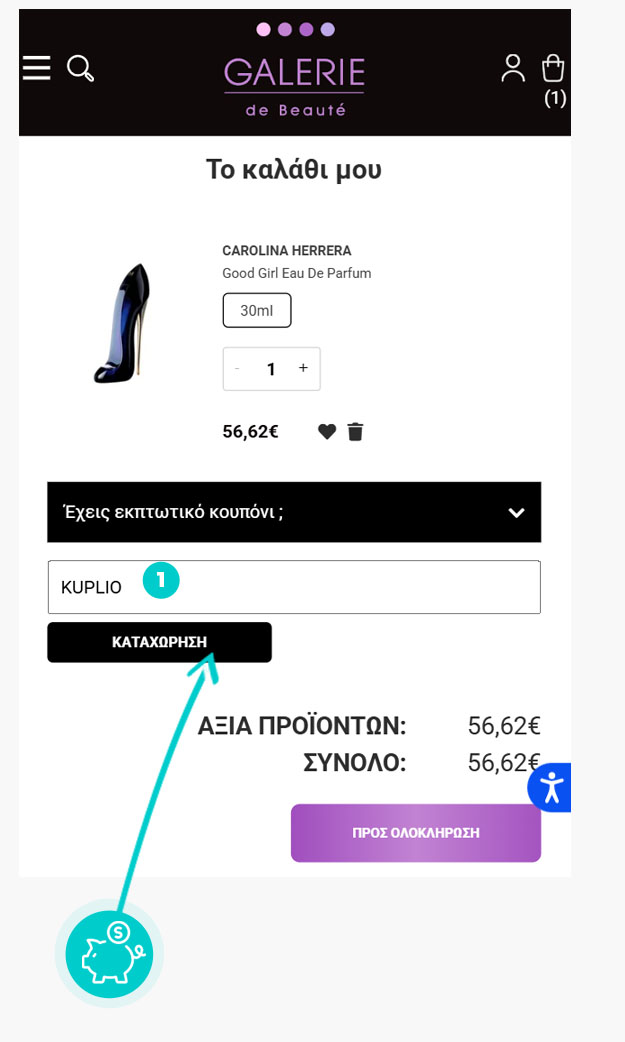 Επιλέξτε το προϊόν που σας ενδιαφέρει στο eshop galeriedebeaute.gr, πατήστε το κουμπί «Προσθήκη στο καλάθι» και το προϊόν θα προστεθεί αυτόματα στο καλάθι αγορών. Απευθείας στο καλάθι αγορών, θα βρείτε το πλαίσιο "Εισαγωγή κωδικού έκπτωσης" στην ενότητα "Σύνοψη" στα δεξιά. Επικολλήστε εδώ τον αντιγραμμένο εκπτωτικό κωδικό ή πληκτρολογήστε τον χειροκίνητα και επιβεβαιώστε με το κουμπί "Εφαρμογή".