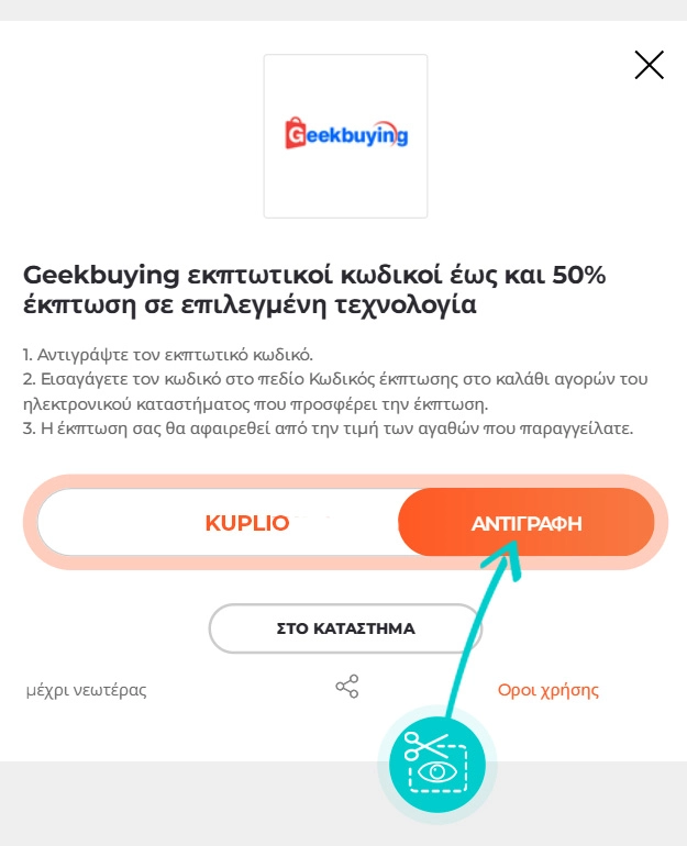 Αντιγράψτε ή σημειώστε τον εκπτωτικό κωδικό και κάντε κλικ στο κουμπί "ΣΤΟ ΚΑΤΑΣΤΗΜΑ". Στη συνέχεια θα ανακατευθυνθείτε απευθείας στο e-shop geekbuying.com.