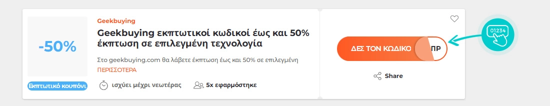 Επιλέξτε έναν συγκεκριμένο εκπτωτικό κωδικό στην ιστοσελίδα μας που θέλετε να χρησιμοποιήσετε στο e-shop geekbuying.com. Κάντε κλικ στο πορτοκαλί κουμπί "ΕΜΦΑΝΙΣΗ ΚΩΔΙΚΟΥ".