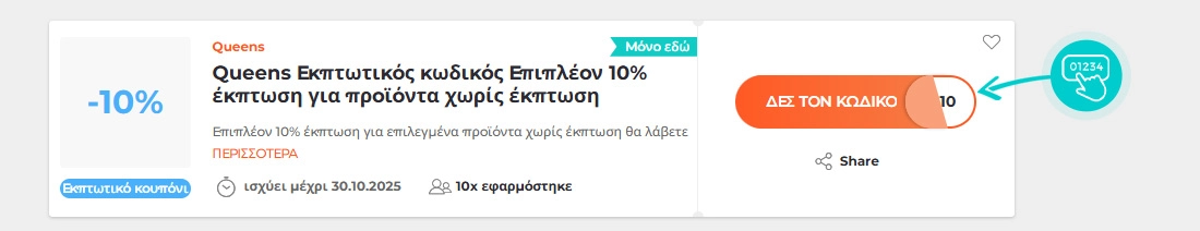 Επιλέξτε έναν συγκεκριμένο εκπτωτικό κωδικό στην ιστοσελίδα μας που θέλετε να χρησιμοποιήσετε στο e-shop iqueens.gr. Κάντε κλικ στο πορτοκαλί κουμπί "ΕΜΦΑΝΙΣΗ ΚΩΔΙΚΟΥ".