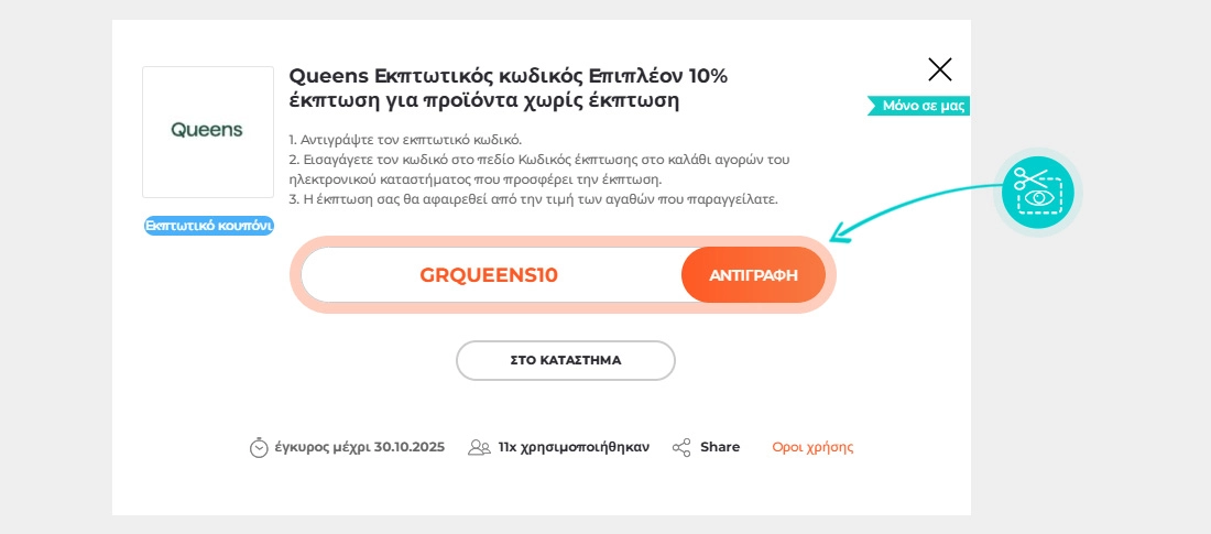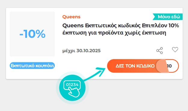 Επιλέξτε μια συγκεκριμένη έκπτωση Queens στην ιστοσελίδα μας και κάντε κλικ στο κουμπί «ΔΕΙΤΕ ΕΚΠΤΩΣΗ». Θα ανακατευθυνθείτε αυτόματα απευθείας στην προσφορά στο ηλεκτρονικό κατάστημα iqueens.gr, όπου μπορείτε να αγοράσετε το προϊόν με έκπτωση.