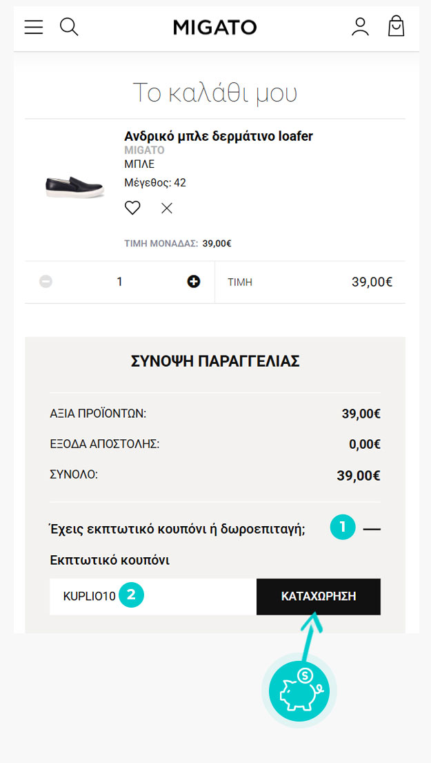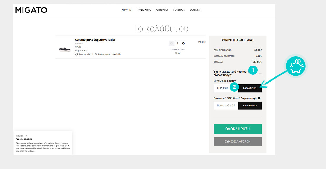 Επιλέξτε το προϊόν που σας ενδιαφέρει στο eshop migato.com, πατήστε το κουμπί «Προσθήκη στο καλάθι» και το προϊόν θα προστεθεί αυτόματα στο καλάθι αγορών. Απευθείας στο καλάθι αγορών, θα βρείτε το πλαίσιο "Εισαγωγή κωδικού έκπτωσης" στην ενότητα "Σύνοψη" στα δεξιά. Επικολλήστε εδώ τον αντιγραμμένο εκπτωτικό κωδικό ή πληκτρολογήστε τον χειροκίνητα και επιβεβαιώστε με το κουμπί "Εφαρμογή".