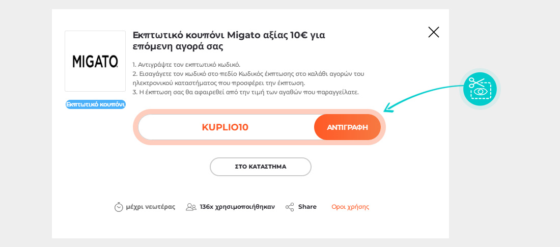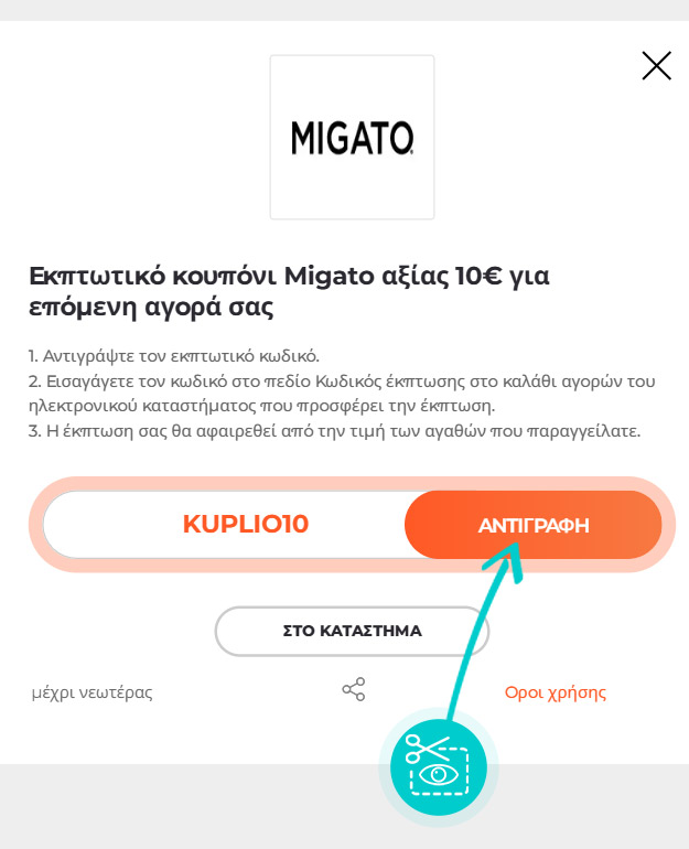 Αντιγράψτε ή σημειώστε τον εκπτωτικό κωδικό και κάντε κλικ στο κουμπί "ΣΤΟ ΚΑΤΑΣΤΗΜΑ". Στη συνέχεια θα ανακατευθυνθείτε απευθείας στο e-shop του migato.com.