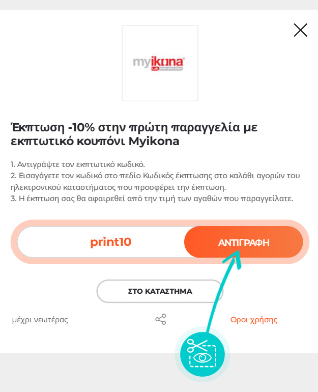 Αντιγράψτε ή σημειώστε τον εκπτωτικό κωδικό και κάντε κλικ στο κουμπί "ΣΤΟ ΚΑΤΑΣΤΗΜΑ". Στη συνέχεια θα ανακατευθυνθείτε απευθείας στο e-shop myikona.gr