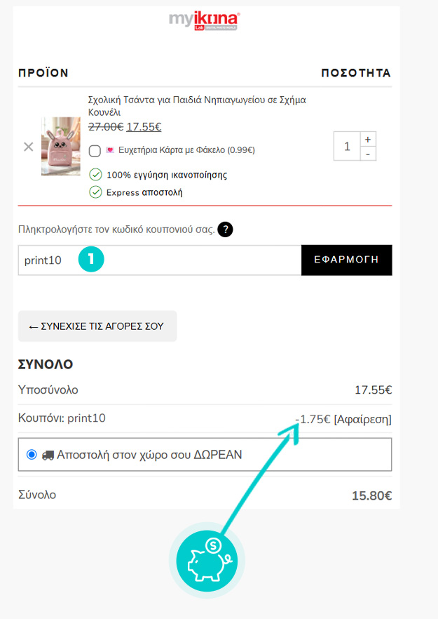 Επιλέξτε το προϊόν που σας ενδιαφέρει στο eshop myikona.gr, πατήστε το κουμπί «Προσθήκη στο καλάθι» και το προϊόν θα προστεθεί αυτόματα στο καλάθι αγορών. Απευθείας στο καλάθι αγορών, θα βρείτε το πλαίσιο "Εισαγωγή κωδικού έκπτωσης" στην ενότητα "Σύνοψη" στα δεξιά. Επικολλήστε εδώ τον αντιγραμμένο εκπτωτικό κωδικό ή πληκτρολογήστε τον χειροκίνητα και επιβεβαιώστε με το κουμπί "Εφαρμογή".