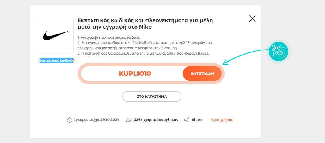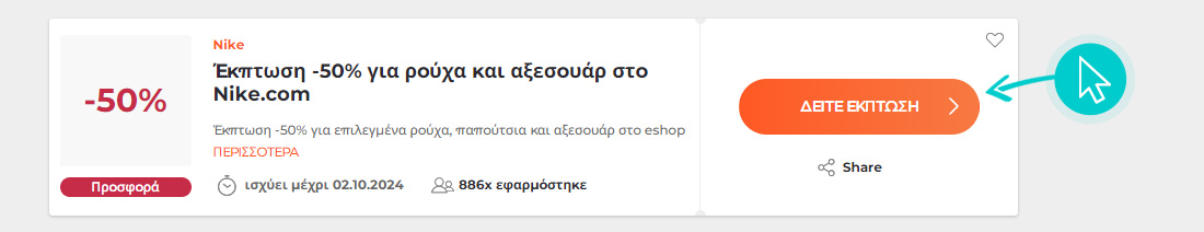 Επιλέξτε έναν συγκεκριμένο εκπτωτικό κωδικό στην ιστοσελίδα μας που θέλετε να χρησιμοποιήσετε στο e-shop nike.com. Κάντε κλικ στο πορτοκαλί κουμπί "ΕΜΦΑΝΙΣΗ ΚΩΔΙΚΟΥ".