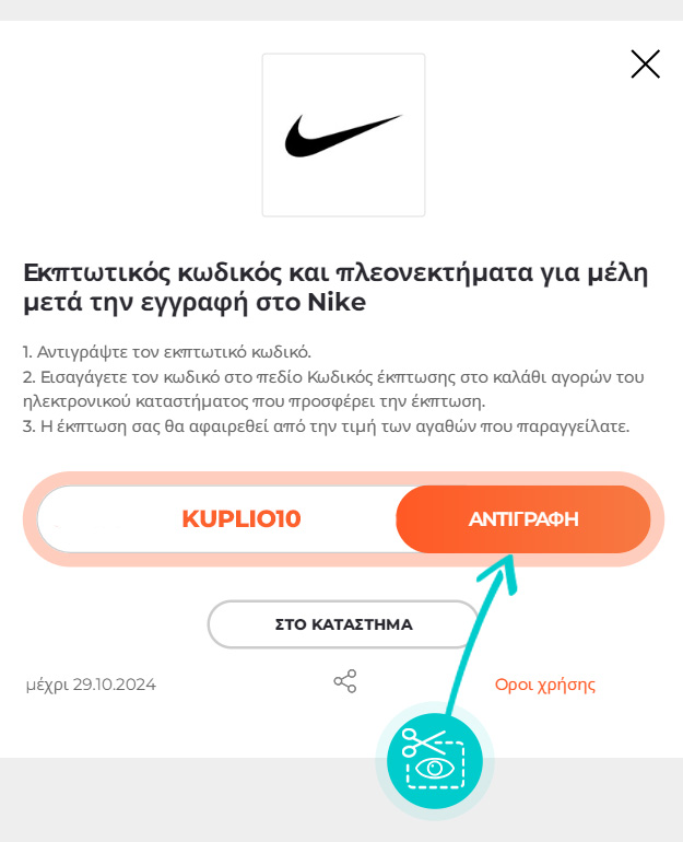 Αντιγράψτε ή σημειώστε τον εκπτωτικό κωδικό και κάντε κλικ στο κουμπί "ΣΤΟ ΚΑΤΑΣΤΗΜΑ". Στη συνέχεια θα ανακατευθυνθείτε απευθείας στο e-shop nike.com