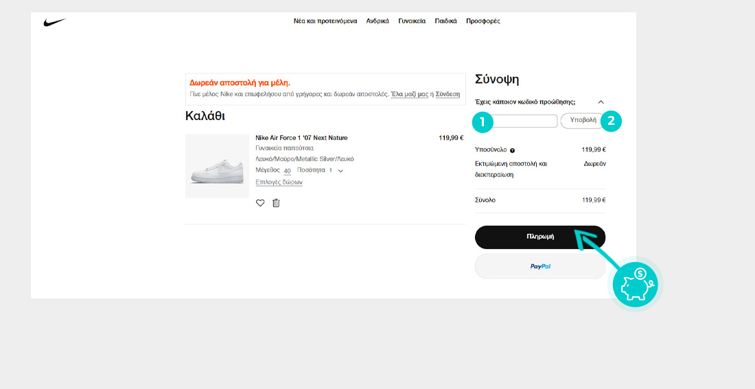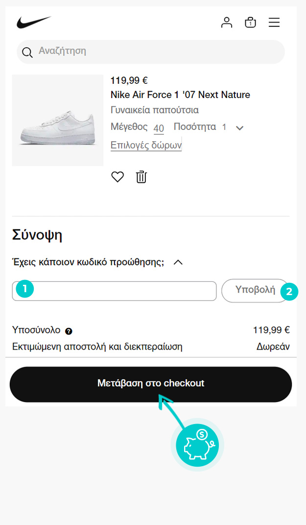 Επιλέξτε το προϊόν που σας ενδιαφέρει στο eshop nike.com, πατήστε το κουμπί «Προσθήκη στο καλάθι» και το προϊόν θα προστεθεί αυτόματα στο καλάθι αγορών. Απευθείας στο καλάθι αγορών, θα βρείτε το πλαίσιο "Εισαγωγή κωδικού έκπτωσης" στην ενότητα "Σύνοψη" στα δεξιά. Επικολλήστε εδώ τον αντιγραμμένο εκπτωτικό κωδικό ή πληκτρολογήστε τον χειροκίνητα και επιβεβαιώστε με το κουμπί "Εφαρμογή".