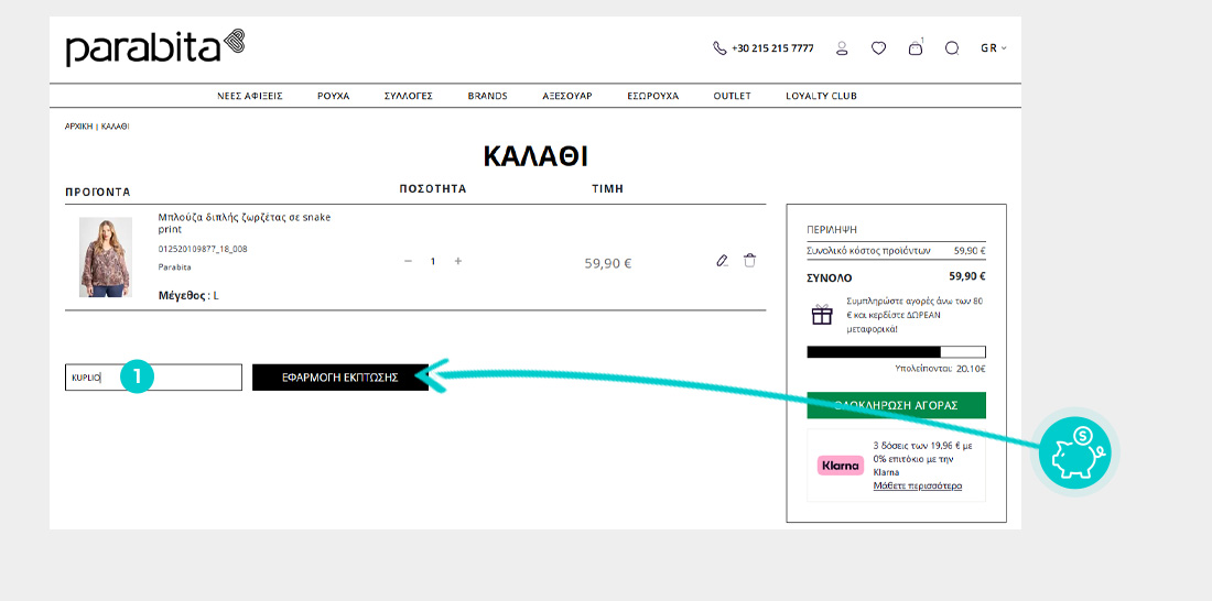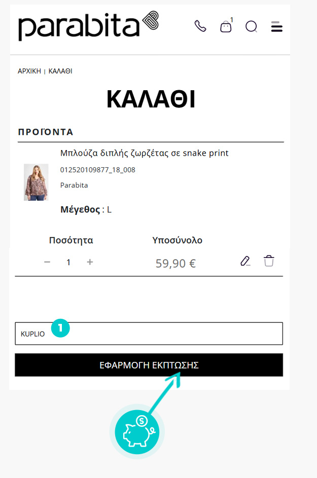 Επιλέξτε το προϊόν που σας ενδιαφέρει στο eshop parabita.com/gr, πατήστε το κουμπί «Προσθήκη στο καλάθι» και το προϊόν θα προστεθεί αυτόματα στο καλάθι αγορών. Απευθείας στο καλάθι αγορών, θα βρείτε το πλαίσιο "Εισαγωγή κωδικού έκπτωσης" στην ενότητα "Σύνοψη" στα δεξιά. Επικολλήστε εδώ τον αντιγραμμένο εκπτωτικό κωδικό ή πληκτρολογήστε τον χειροκίνητα και επιβεβαιώστε με το κουμπί "Εφαρμογή".
