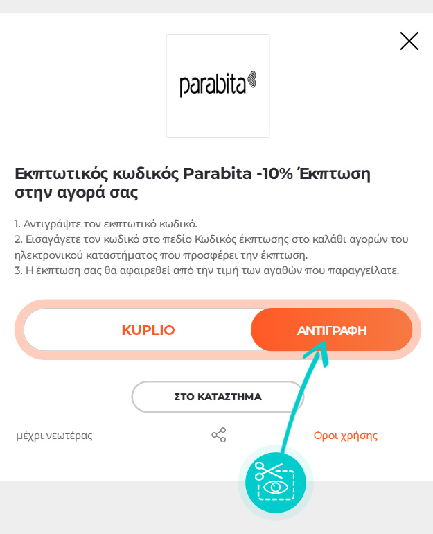 Αντιγράψτε ή σημειώστε τον εκπτωτικό κωδικό και κάντε κλικ στο κουμπί "ΣΤΟ ΚΑΤΑΣΤΗΜΑ". Στη συνέχεια θα ανακατευθυνθείτε απευθείας στο e-shop parabita.com/gr.