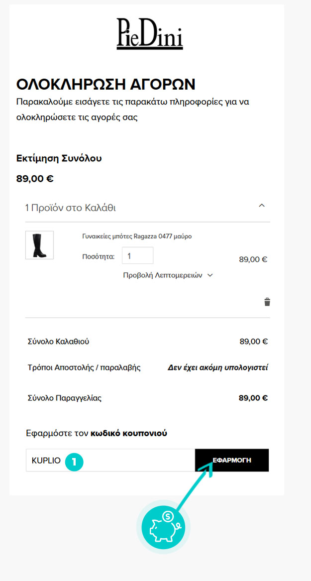 Δεν ξέρετε πώς ακριβώς λειτουργούν οι κωδικοί έκπτωσης Piedini; Σας προσφέρουμε έναν γρήγορο και εύκολο τρόπο για να εφαρμόσετε κωδικούς έκπτωσης κατά τις αγορές.