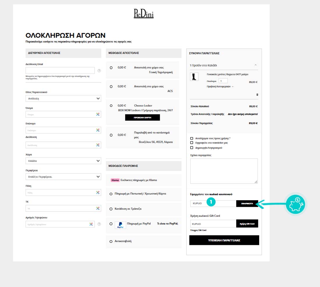 Επιλέξτε το προϊόν που σας ενδιαφέρει στο eshop του piedini.gr, πατήστε το κουμπί «Προσθήκη στο καλάθι» και το προϊόν θα προστεθεί αυτόματα στο καλάθι αγορών. Απευθείας στο καλάθι αγορών, θα βρείτε το πλαίσιο "Εισαγωγή κωδικού έκπτωσης" στην ενότητα "Σύνοψη" στα δεξιά. Επικολλήστε εδώ τον αντιγραμμένο εκπτωτικό κωδικό ή πληκτρολογήστε τον χειροκίνητα και επιβεβαιώστε με το κουμπί "Εφαρμογή".