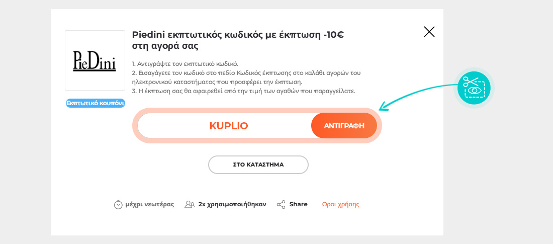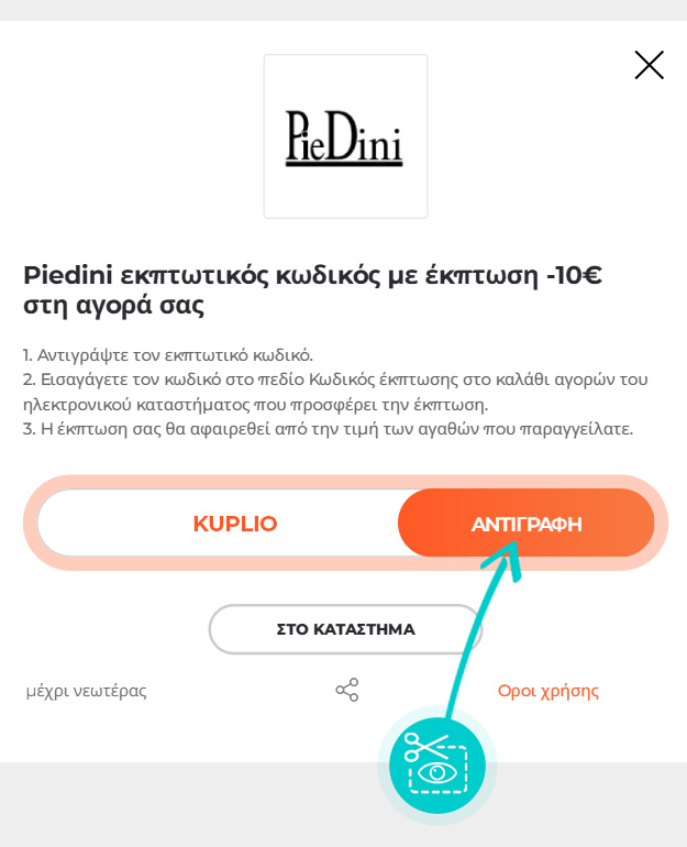Αντιγράψτε ή σημειώστε τον εκπτωτικό κωδικό και κάντε κλικ στο κουμπί "ΣΤΟ ΚΑΤΑΣΤΗΜΑ". Στη συνέχεια θα ανακατευθυνθείτε απευθείας στο e-shop piedini.gr.