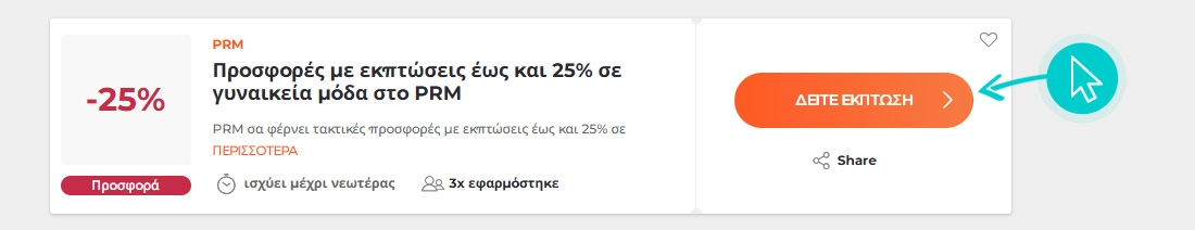 Επιλέξτε μια συγκεκριμένη έκπτωση PRM στην ιστοσελίδα μας και κάντε κλικ στο κουμπί «ΔΕΙΤΕ ΕΚΠΤΩΣΗ». Θα ανακατευθυνθείτε αυτόματα απευθείας στην προσφορά στο ηλεκτρονικό κατάστημα prm.com/gr, όπου μπορείτε να αγοράσετε το προϊόν με έκπτωση.