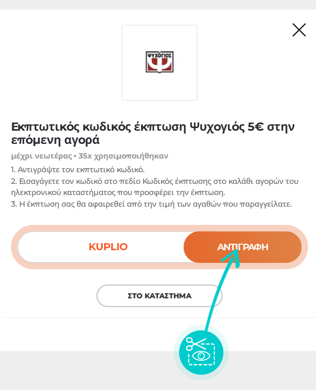 Αντιγράψτε ή σημειώστε τον εκπτωτικό κωδικό και κάντε κλικ στο κουμπί "ΣΤΟ ΚΑΤΑΣΤΗΜΑ". Στη συνέχεια θα ανακατευθυνθείτε απευθείας στο e-shop psichogios.gr.
