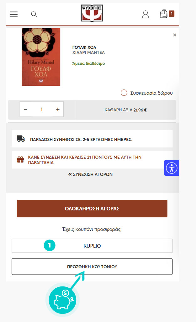 Ποσό έκπτωσης: -100% Πώς να εφαρμόσετε τον κωδικό; Κάντε κλικ εδώ και μάθετε πώς να το κάνετε.Συγκεντρώνετε τους πρώτους 50 πόντους και μπορείτε να τους εξαργυρώσετε κερδίζοντας έκπτωση 2 € στην επόμενη αγορά σας, ή να περιμένετε να πάρετε μεγαλύτερο δώρο. Για κάθε 1 € αό την αγορά σας από το psichogios.gr κερδίζετε 1 πόντο. Οι εκπτώσεις, τα κουπόνια είναι σύμφωνα με τους όρους και τις προϋποθέσεις της εταιρείας, ενδέχεται να υπάρξουν αλλαγές.