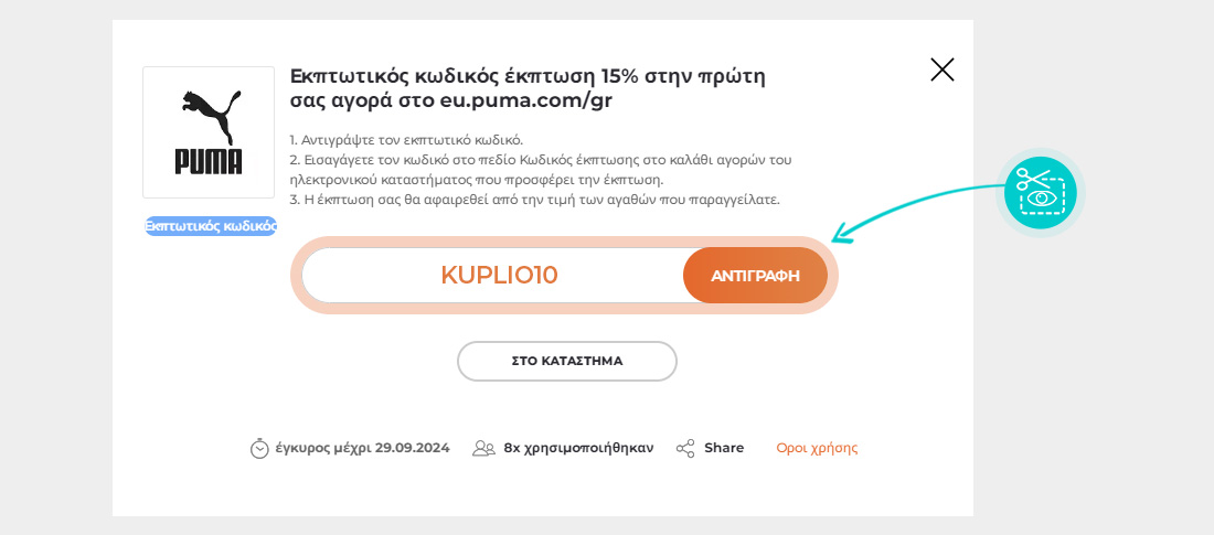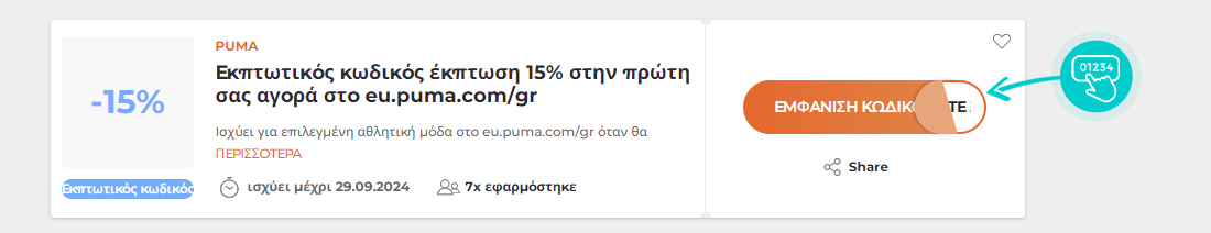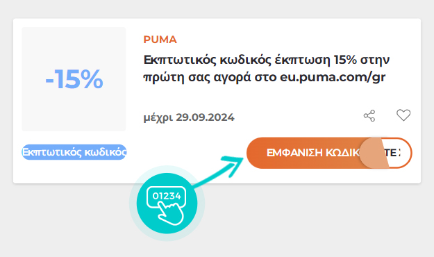 Επιλέξτε έναν συγκεκριμένο εκπτωτικό κωδικό στην ιστοσελίδα μας που θέλετε να χρησιμοποιήσετε στο e-shop eu.puma.com/gr. Κάντε κλικ στο πορτοκαλί κουμπί "ΕΜΦΑΝΙΣΗ ΚΩΔΙΚΟΥ".