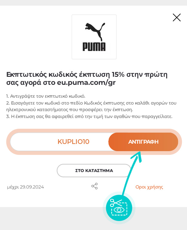 Αντιγράψτε ή σημειώστε τον εκπτωτικό κωδικό και κάντε κλικ στο κουμπί "ΣΤΟ ΚΑΤΑΣΤΗΜΑ". Στη συνέχεια θα ανακατευθυνθείτε απευθείας στο e-shop eu.puma.com/gr.