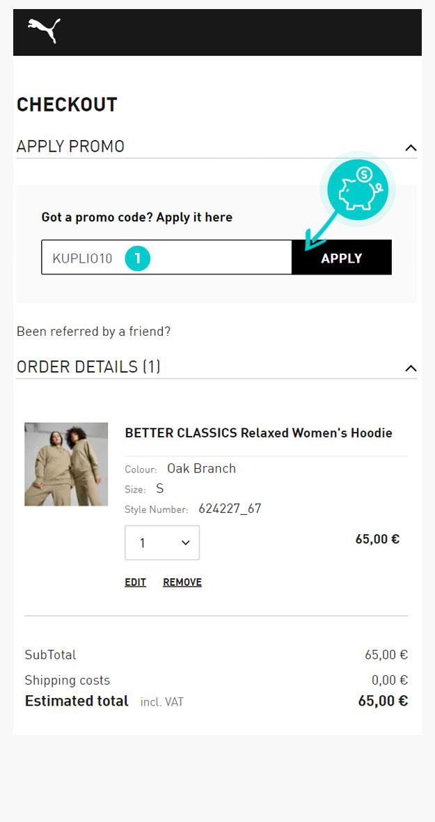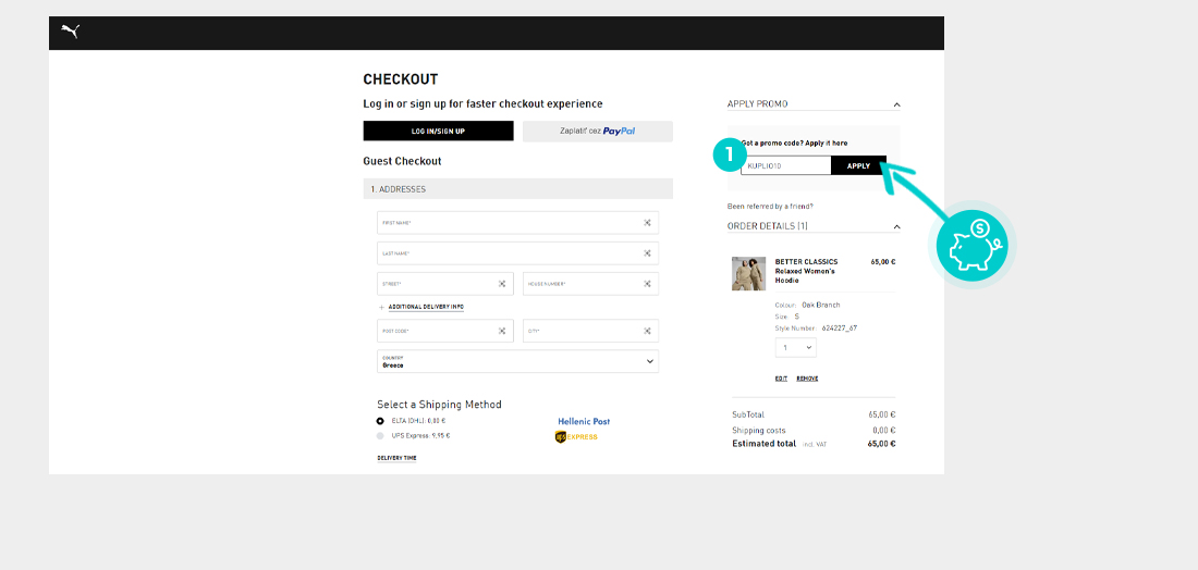 Δεν ξέρετε πώς ακριβώς λειτουργούν οι κωδικοί έκπτωσης Puma; Σας προσφέρουμε έναν γρήγορο και εύκολο τρόπο για να εφαρμόσετε κωδικούς έκπτωσης κατά τις αγορές: