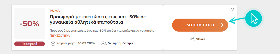 Επιλέξτε μια συγκεκριμένη έκπτωση Puma στην ιστοσελίδα μας και κάντε κλικ στο κουμπί «ΔΕΙΤΕ ΕΚΠΤΩΣΗ». Θα ανακατευθυνθείτε αυτόματα απευθείας στην προσφορά στο ηλεκτρονικό κατάστημα eu.puma.com/gr, όπου μπορείτε να αγοράσετε το προϊόν με έκπτωση.