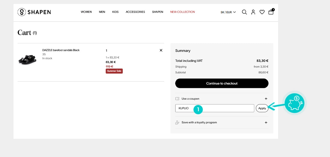 Επιλέξτε το προϊόν που σας ενδιαφέρει στο eshop shapenbarefoot.com, πατήστε το κουμπί «Προσθήκη στο καλάθι» και το προϊόν θα προστεθεί αυτόματα στο καλάθι αγορών. Απευθείας στο καλάθι αγορών, θα βρείτε το πλαίσιο "Εισαγωγή κωδικού έκπτωσης" στην ενότητα "Σύνοψη" στα δεξιά. Επικολλήστε εδώ τον αντιγραμμένο εκπτωτικό κωδικό ή πληκτρολογήστε τον χειροκίνητα και επιβεβαιώστε με το κουμπί "Εφαρμογή".