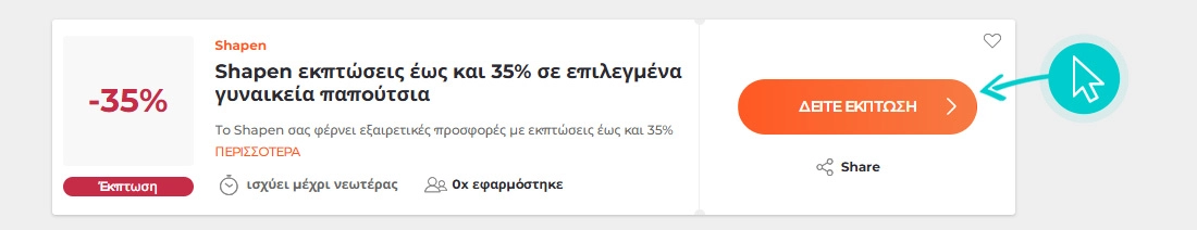Επιλέξτε μια συγκεκριμένη έκπτωση Shapen στην ιστοσελίδα μας και κάντε κλικ στο κουμπί «ΔΕΙΤΕ ΕΚΠΤΩΣΗ». Θα ανακατευθυνθείτε αυτόματα απευθείας στην προσφορά στο ηλεκτρονικό κατάστημα shapenbarefoot.com, όπου μπορείτε να αγοράσετε το προϊόν με έκπτωση.