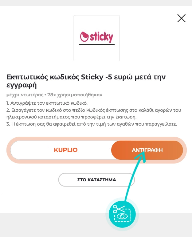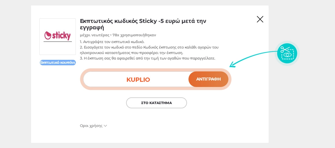 Αντιγράψτε ή σημειώστε τον εκπτωτικό κωδικό και κάντε κλικ στο κουμπί "ΣΤΟ ΚΑΤΑΣΤΗΜΑ". Στη συνέχεια θα ανακατευθυνθείτε απευθείας στο e-shop sticky.gr.