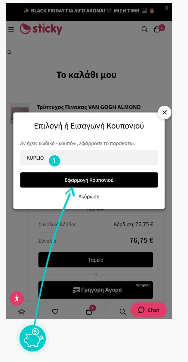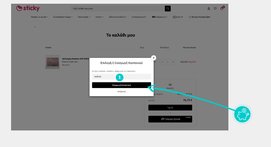 Επιλέξτε το προϊόν που σας ενδιαφέρει στο eshop του sticky.gr, πατήστε το κουμπί «Προσθήκη στο καλάθι» και το προϊόν θα προστεθεί αυτόματα στο καλάθι αγορών. Απευθείας στο καλάθι αγορών, θα βρείτε το πλαίσιο "Εισαγωγή κωδικού έκπτωσης" στην ενότητα "Σύνοψη" στα δεξιά. Επικολλήστε εδώ τον αντιγραμμένο εκπτωτικό κωδικό ή πληκτρολογήστε τον χειροκίνητα και επιβεβαιώστε με το κουμπί "Εφαρμογή".