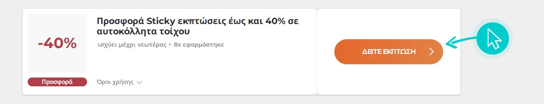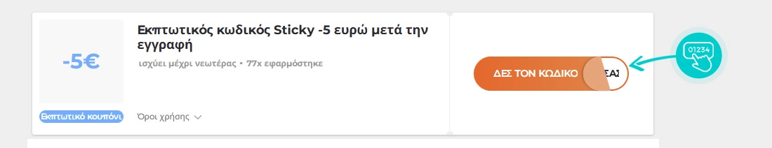 Επιλέξτε έναν συγκεκριμένο εκπτωτικό κωδικό στην ιστοσελίδα μας που θέλετε να χρησιμοποιήσετε στο e-shop sticky.gr. Κάντε κλικ στο πορτοκαλί κουμπί "ΕΜΦΑΝΙΣΗ ΚΩΔΙΚΟΥ".