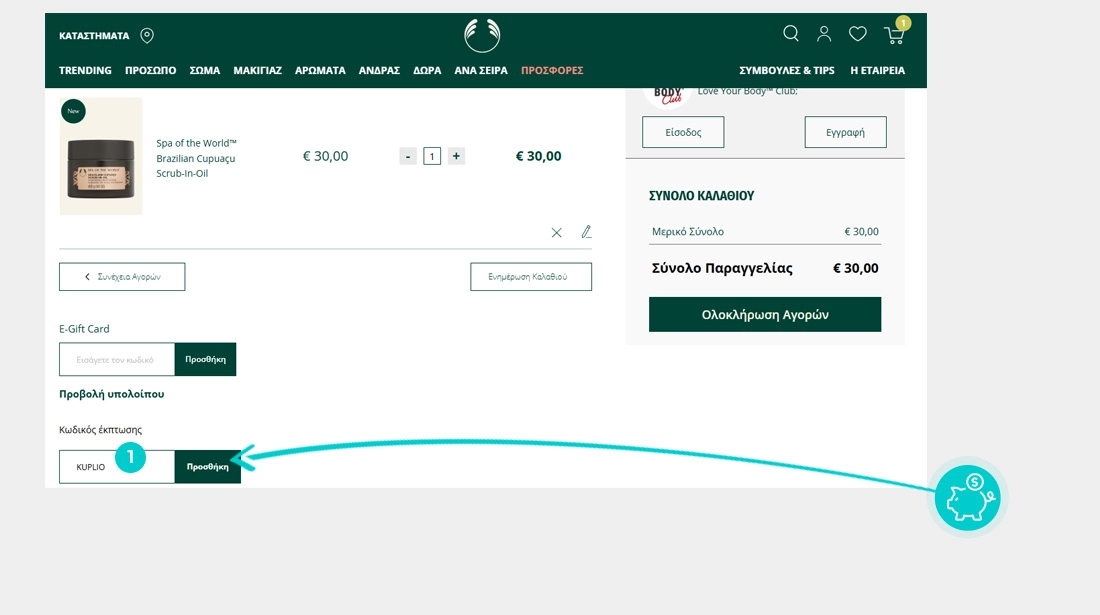 Επιλέξτε το προϊόν που σας ενδιαφέρει στο eshop thebodyshop.gr, πατήστε το κουμπί «Προσθήκη στο καλάθι» και το προϊόν θα προστεθεί αυτόματα στο καλάθι αγορών. Απευθείας στο καλάθι αγορών, θα βρείτε το πλαίσιο "Εισαγωγή κωδικού έκπτωσης" στην ενότητα "Σύνοψη" στα δεξιά. Επικολλήστε εδώ τον αντιγραμμένο εκπτωτικό κωδικό ή πληκτρολογήστε τον χειροκίνητα και επιβεβαιώστε με το κουμπί "Εφαρμογή".