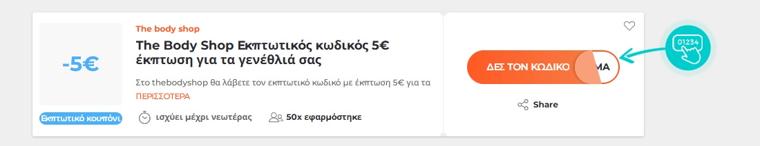 Επιλέξτε έναν συγκεκριμένο εκπτωτικό κωδικό στην ιστοσελίδα μας που θέλετε να χρησιμοποιήσετε στο e-shop thebodyshop.gr. Κάντε κλικ στο πορτοκαλί κουμπί "ΕΜΦΑΝΙΣΗ ΚΩΔΙΚΟΥ".